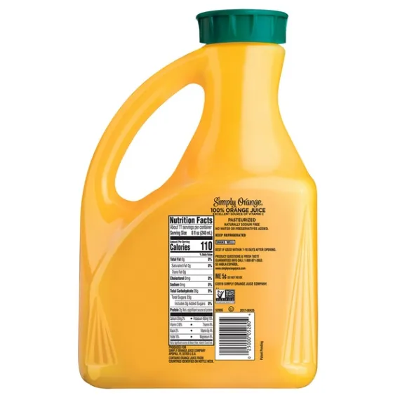 Details Ingredients 100% ORANGE JUICE Product features Experience the delicious taste of Simply beverages. Our juices, juice drinks, and lemonades are delicious, so try them all and find your favorite. Product Features Not from concentrate 110 calories per 8 fl oz serving 100% orange juice A full day's supply of vitamin C Naturally sodium free No water or preservatives added Kosher - P Produced for Simply Orange Juice Company, Apopka, FL, 32703, U.S.A. www.simplyorangejuice.com ©2016 Simply Orange Juice Company. Patent Pending Net Quantity of Content 11.0 X 8 Oz.