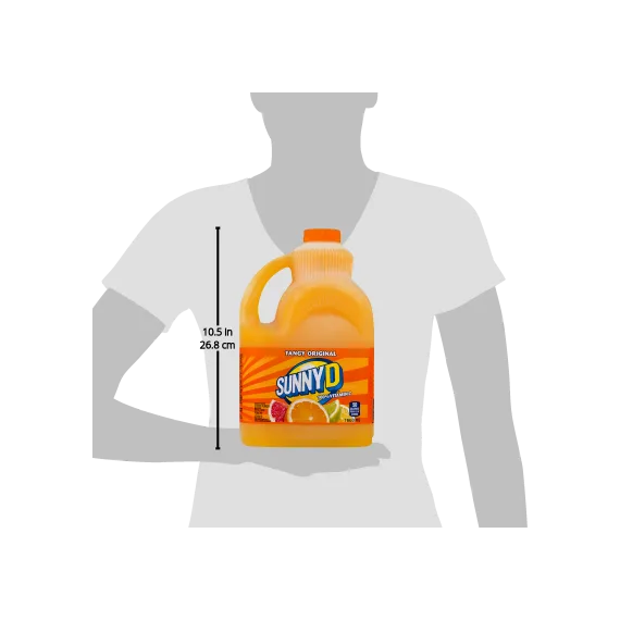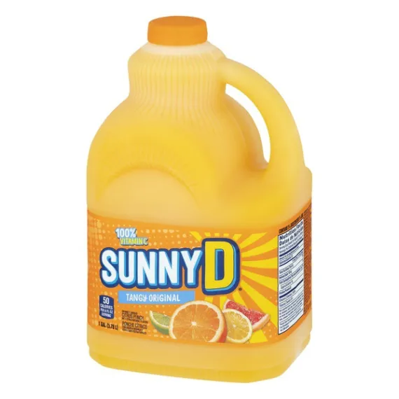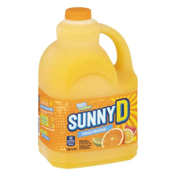 Details Ingredients WATER, HIGH FRUCTOSE CORN SYRUP AND 2% OR LESS OF EACH OF THE FOLLOWING: CONCENTRATED JUICES (ORANGE, TANGERINE, APPLE, LIME, GRAPEFRUIT, PEAR), CITRIC ACID, ASCORBIC ACID (VITAMIN C), THIAMIN HYDROCHLORIDE VITAMIN B1), NATURAL FLAVORS, MODIFIED CORNSTARCH, CANOLA IL, SODIUM CITRATE, CELLULOSE GUM, SUCRALOSE, ACESULFAME POTASSIUM, NEOTAME, SODIUM HEXAMETAPHOSPHATE, POTASSIUM SORBATE TO PROTECT FLAVOR, YELLOW #5, YELLOW #6. Show more Product features Sunny D® Citrus Punch Tangy Original. Contains 50 calories per 8 fl oz serving. An excellent source of vitamin C. Citrus punch with other natural flavors. Most boldly unique orange drink on the planet. Sunny D® Citrus Punch Tangy Original. 100% Vitamin C. 50 calories per 8 fl oz serving. Orange flavored. Citrus punch with other natural flavors. 1 gal (3.78 L). Kosher Special Features Contains 5% juice Net Quantity of Content 16 X 8 fl oz
