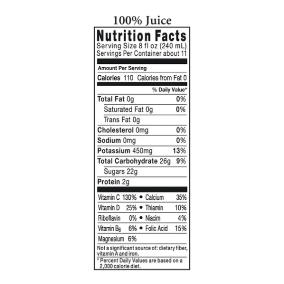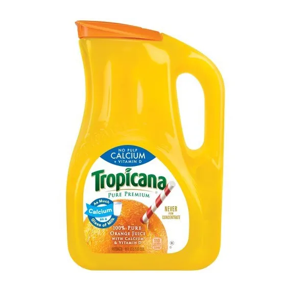 Details Ingredients 100% ORANGE JUICE, CALCIUM HYDROXIDE*, CITRIC ACID*, MALIC ACID* AND VITAMIN D3*. Product features Tropicana Pure Premium Orange Juice is the classic, timeless and healthy drink that people of all ages have always enjoyed. It contains more than a whole day's recommended amount of vitamin C, which can help prevent colds, flus and other common illnesses. This Tropicana no pulp orange juice is also an outstanding source of vitamin D and calcium, which helps build and maintain strong bones and teeth. It comes in an 89 fl oz jug that is ideal for the whole family. This Tropicana Pure Premium Orange Juice is pasteurized and never from concentrate for a smooth and consistent feel. Tropicana 100% Orange Juice Calcium + Vitamin D No Pulp, 89.0 fl oz: Tropicana Pure Premium No Pulp Calcium Vitamin D Orange Juice: Pure 100% Florida orange juice with calcium and vitamin D Excellent source of calcium, vitamin C, and vitamin D Good source of folic acid and potassium and 2 servings of fruit Pasteurized Never from concentrate 110 calories per serving Kosher Net Quantity of Content ABOUT 11 X 8 fl oz