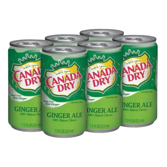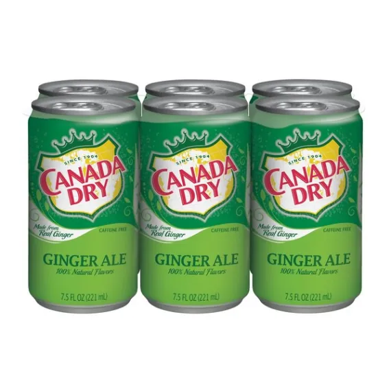 Details Ingredients CARBONATED WATER, HIGH FRUCTOSE CORN SYRUP, CITRIC ACID, SODIUM BENZOATE (PRESERVATIVE), NATURAL FLAVORS, CARAMEL COLOR Show more Product features Any time is a great time for the crisp goodness of Canada Dry Ginger Ale. Never skimping on quality, Canada Dry Ginger Ale offers refreshingly real ginger taste that's made from real ginger and is caffeine free. Enhance your favorite cocktails with a sparkling splash of Canada Dry or enjoy by itself for crisp, clean refreshment. Creating quality beverages and mixers since 1904, enjoy the best in refreshment with Canada Dry. Made from real ginger100% natural flavors and caffeine freeGreat crisp and refreshing beverage and cocktail mixerOne 6-pack of 7.5 fluid ounce cans Net Quantity of Content 6 X 7.5 fl oz