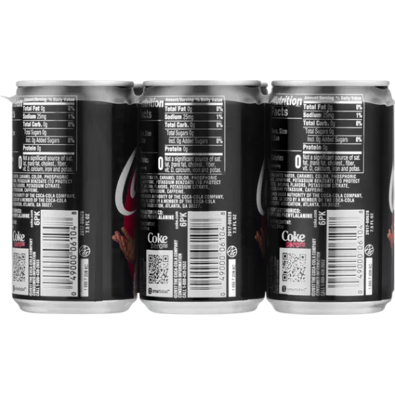 Details Ingredients CARBONATED WATER, CARAMEL COLOR, PHOSPHORIC ACID, ASPARTAME, POTASSIUM BENZOATE (TO PROTECT TASTE), NATURAL FLAVORS, POTASSIUM CITRATE, ACESULFAME POTASSIUM, CAFFEINE. Show more Product features Coca Cola Zero Acesulfame Potassium Aspartame Calcium Carbonate Water 6Pk Coca-Cola Zero Mini-Cans, 7.5 fl oz, 6 Pack Net Quantity of Content 6 X 1 Can