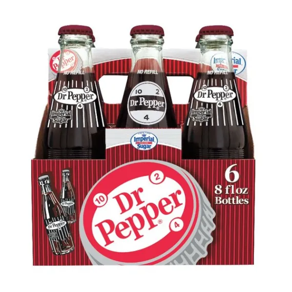 Details Ingredients CARBONATED WATER, CANE SUGAR, CARAMEL COLOR, PHOSPHORIC ACID, NATURAL AND ARTIFICIAL FLAVORS, SODIUM BENZOATE (PRESERVATIVE), CAFFEINE Show more Product features Dr Pepper is commemorating over 125 years of its Always One of a Kind taste with this 1960's retro edition flavor and packaging. Enjoy the same original recipe of 23 signature flavors blended into one deliciously unique beverage, made with sugar. Established in 1885, Dr Pepper has an iconic history of delivering satisfying refreshment. Get a blast from the past when you taste Dr Pepper Made with Sugar. An original blend of 23 authentic flavors with sugarAlways One of a KindOne 6-pack of 8 fluid ounce glass bottles Net Quantity of Content 6 X 8 fl oz