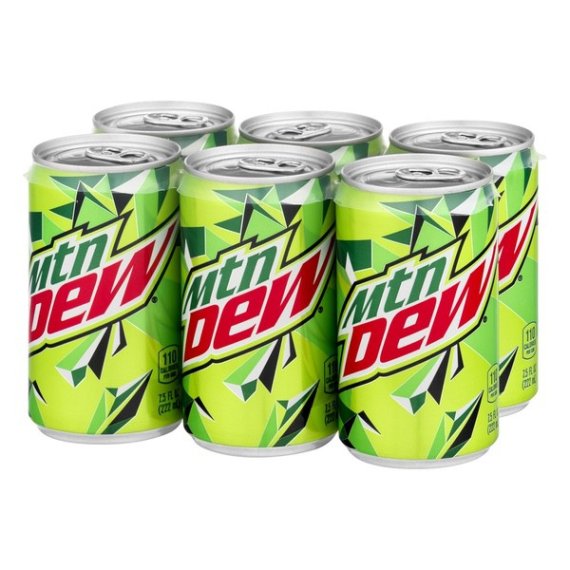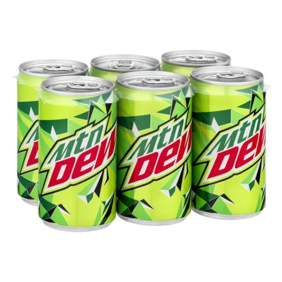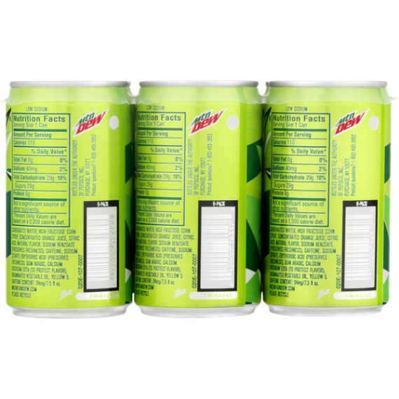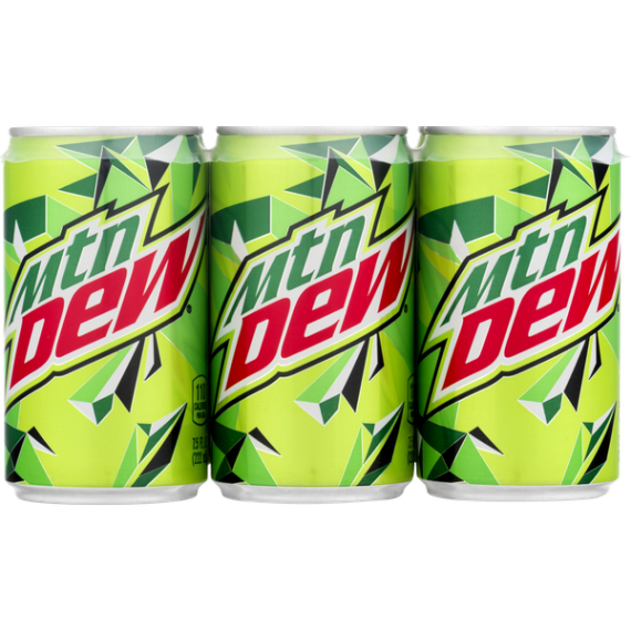 Details Ingredients Carbonated Water, High Fructose Corn Syrup, Concentrated Orange Juice, Citric Acid, Natural Flavor, Sodium Benzoate (Preserves Freshness), Caffeine, Sodium Citrate, Erythorbic Acid (Preserves Freshness), Gum Arabic, Calcium Disodium EDTA (to protect flavor), Brominated Vegetable Oil, Yellow 5. Show more Product features Mountain Dew, the original instigator, refreshes with its one of a kind great taste. 6 Pack of 7.5 fl oz mini cans Mtn Dew exhilarates and quenches with its one of a kind, bold taste Chuggable intense refreshment Crack open a cold can of Mtn Dew and refresh your taste buds