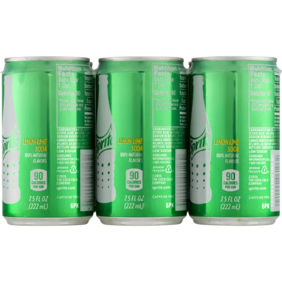 Details Ingredients Carbonated Water, High Fructose Corn Syrup, Citric Acid, Natural Flavors, Sodium Citrate, Sodium Benzoate (to Protect Taste). Product features Sprite®. Made with 100% natural flavors. Low sodium. Caffeine free. Sprite Mini-Cans, 7.5 fl oz, 6 Pack