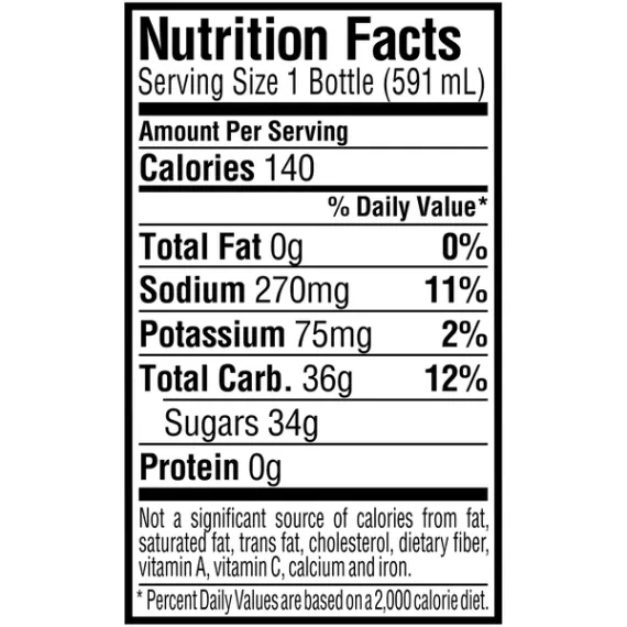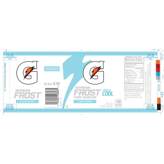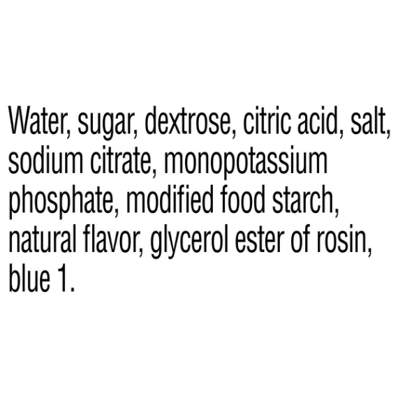 Details Ingredients WATER, SUGAR, DEXTROSE, CITRIC ACID, SALT, SODIUM CITRATE, MONOPOTASSIUM PHOSPHATE, MODIFIED FOOD STARCH, NATURAL FLAVOR, GLYCEROL ESTER OF ROSIN, BLUE 1. Show more Product features The drink that changed the game. Backed by science, Gatorade G Lemon-Lime Thirst Quencher Sports Drink hydrates better than water, which is why it's been trusted by some of the world's best athletes for over 40 years. Smart choices made easy. Gatorade is a smart choice for athletes because it rehydrates, replenishes and refuels in ways water can't. Proven hydration with electrolytes. Rehydrate, replenish, refuel. Fluids, electrolytes, carbohydrates. Kosher. Ingredients: Water, Sucrose Syrup, High Fructose Corn Syrup (Glucose-Fructose Syrup), Citric Acid, Natural Flavors, Salt, Sodium Citrate, Monopotassium Phosphate, Glycerol Ester Of Wood Rosin, Blue 1. Instructions: Shake well. Refrigerate after opening. Gatorade Thirst Quencher Frost Sports Drink, Glacier Freeze, 20 Fl Oz, 8 Ct Special Features Fluids, electrolytes, carbohydrates Net Quantity of Content 1 X 591 mL