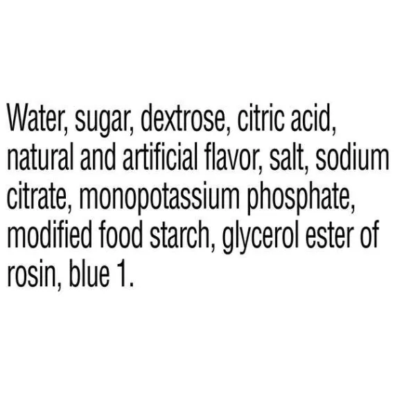 Details Ingredients Water, Sucrose Syrup, High Fructose Corn Syrup (Glucose-Fructose Syrup), Citric Acid, Natural And Artificial Flavors, Salt, Sodium Citrate, Monopotassium Phosphate, Glycerol Ester of Wood Rosin, Blue 1. Show more Product features No fruit juiceSmart choices made easy. Gatorade is a smart choice for athletes because it rehydrates, replenishes and refuels in ways water can't. Gatorade G Series Perform Cool Blue Sports Drink:No fruit juiceRehydrates, replenishes and refuels in ways water can't Special Features Fluids, electrolytes, carbohydrates Net Quantity of Content 1 X 591.00 ml