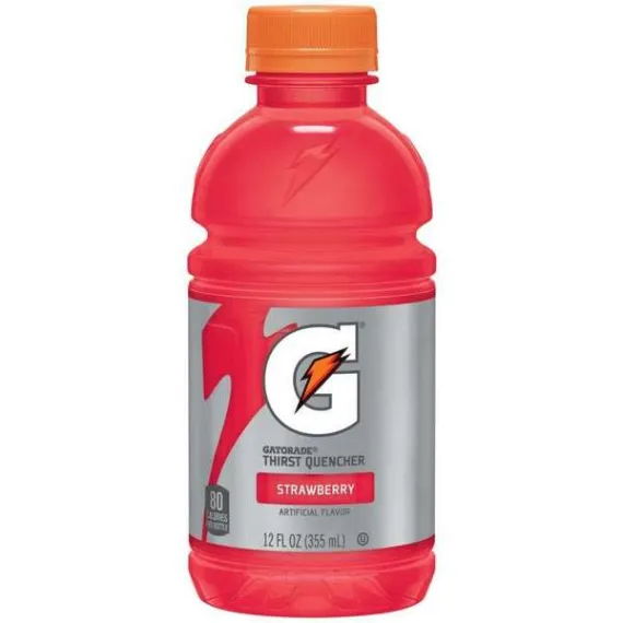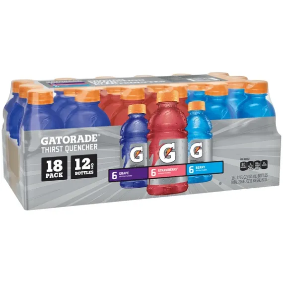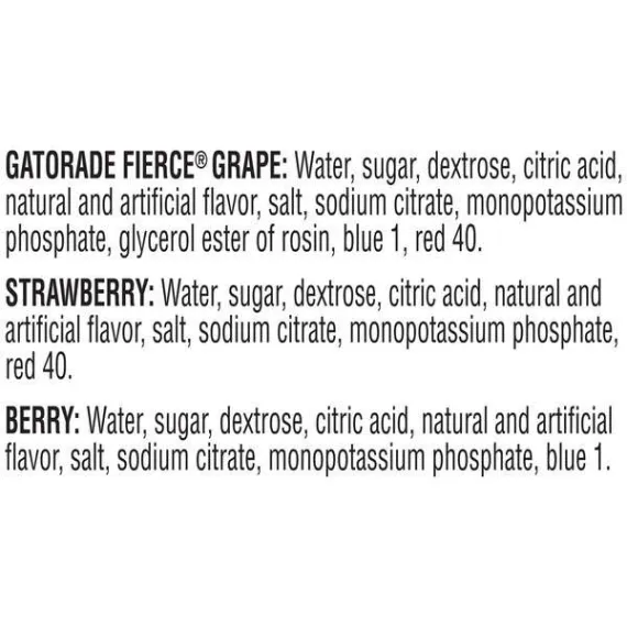 Details Ingredients Gatorade Fierce Grape: Water, Sugar, Dextrose, Citric Acid, Natural and Artificial Flavor, Salt, Sodium Citrate, Monopotassium Phosphate, Glycerol Ester of Rosin, Blue 1, Red 40. Strawberry: Water, Sugar, Dextrose, Citric Acid, Natural and Artificial Flavor, Salt, Sodium Citrate, Monopotassium Phosphate, Red 40. Berry: Water, Sugar, Dextrose, Citric Acid, Natural and Artificial Flavor, Salt, Sodium Citrate, Monopotassium Phosphate, Blue 1. Show more Product features This Gatorade Variety Pack is a smart choice for anyone who wants to stay hydrated. Packed with electrolytes and delicious flavor, this beverage is ideal for drinking during hot weather and after exercising. This Gatorade sports drink pack includes 18 bottles in three different flavors, including grape, strawberry and berry. Each bottle comes with 12 oz. Housed in a convenient storage box, this beverage set is easy to transport and simple to store on your shelf. Buying in bulk saves money and time. Keep this Gatorade on hand for the next time you need to quench your thirst. Gatorade: Variety Pack 12 Oz, 18 Pack:Includes 3 flavors: grape, berry and strawberryEighteen 12 oz bottlesEnergy drink pack is a thirst quencherPacked with electrolytesIdeal for hydrationConsume during hot weather and after exerciseDeliciously flavorful Gatorade sports drink Net Quantity of Content 18 X 355.00 ml