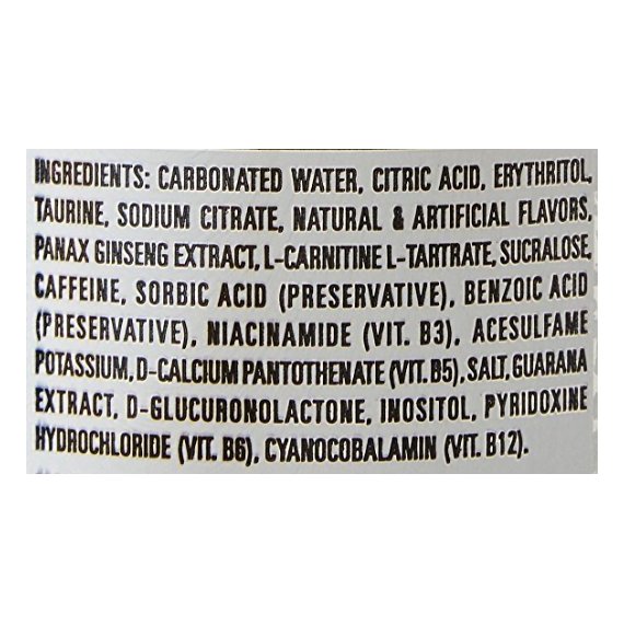 Details Ingredients CARBONATED WATER, CITRIC ACID, ERYTHRITOL, TAURINE,SODIUM CITRATE,NATURAL & ARTIFICIAL FLAVORS,PANAX GINSENG EXTRACT,L-CARNITINE L-TARTRATE,SUCRALOSE,CAFFEINE,SORBIC ACID (PRESERVATIVE), BENZOIC ACID (PRESERVATIVE), NIACINAMIDE (VIT. B3), ACESULFAME POTASSIUM, D-CALCIUM PANTOTHENATE (VIT. B5), SALT, GUARANA EXTRACT, D-GLUCURONOLACTONE,INOSITOL,PYRIDOXINE HYDROCHLORIDE (VIT. B6), CYANOCOBALAMIN (VIT. B12). Show more Product features Energy Drink, Zero Ultra, Energy, 10 Pack, Box 16 OZ Zero calories per serving. Zero calories + zero sugar. Some people are impossible to please. As soon as they get what they thought they wanted they always want more. Our team riders and Monster girls are no different - they've been dropping some hints lately. They've been asking us for a new Monster drink. A little less sweet, lighter-tasting. Zero calories, but with a full load of our Monster energy blend. Sure, white is the new black. We want all out: Monster Energy Zero Ultra. Unleash the ultra beast! www.MonsterEnergy.com. Facebook. Instagram. Twitter. YouTube. www.monsterenergy.com. Monster Energy Blend: taurine, Panax ginseng extract, L-carnitine, caffeine, guarana extract, Glucuronolactone, inositol. Caffeine from All Sources: 70 mg per 8 fl oz serving (140 mg per can). Consume Responsibly: Not recommended for children, people sensitive to caffeine, pregnant women or women who are nursing. 10 - 16 fl oz (473 ml) cans [160 fl oz (4.73 l)] 1 Monster Way Corona, CA 92879 2012 Monster Energy Company Monster Zero Ultra Energy Drinks:Zero caloriesZero sugar Special Features No Net Quantity of Content 20 X 8.0 fl oz