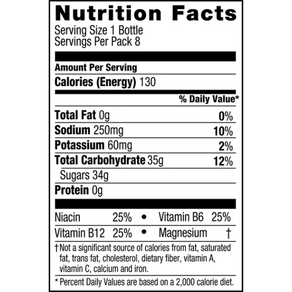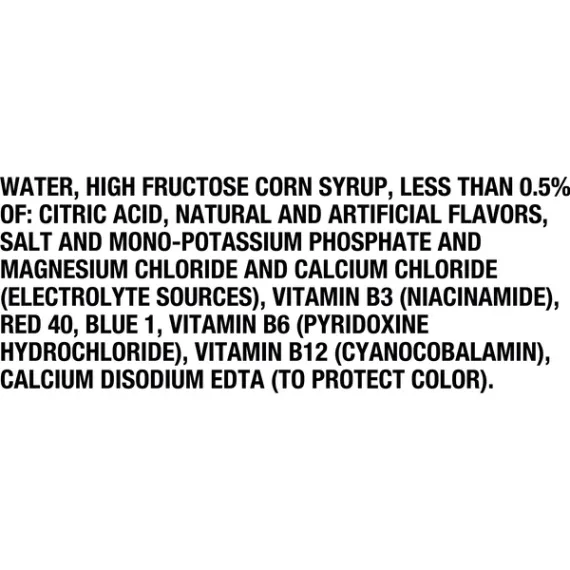 Details Ingredients High Fructose Corn Syrup, Less Than 0.5% of: Citric Acid, Natural and Artificial Flavors, Salt, and Mono-Potassium Phosphate, and Magnesium Chloride, and Calcium Chloride (Electrolyte Sources), Vitamin B3 (Niacinamide), Red 40, Blue 1, Vitamin B6 (Pyridoxine Hydrochloride), Vitamin B12 (Cyanocobalamin), Calcium Disodium EDTA (to Protect Color). Show more Product features The ION4 Advanced Electrolyte System helps replenish four electrolytes lost in sweat. Powerade is formulated with a 6% carbohydrate solution to help provide energy to working muscles, and vitamins B3, B6 and B12. Net Quantity of Content 8 X 1 Bottle