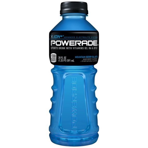 Details Ingredients Water, High Fructose Corn Syrup, Less than 0.5% of: Citric Acid, Salt and Magnesium Chloride and Calcium Chloride and Mono-Potassium Phosphate (Electrolyte Sources), Natural Flavors, Modified Food Starch, Calcium Disodium EDTA (To Protect Color), Medium Chain Triglycerides, Sucrose Acetate Isobutyrate, Vitamin B3 (Niacinamide), Vitamin B6 (Pyridoxine Hydrochloride), Vitamin B12, Blue 1. Show more Product features The ION4 Advanced Electrolyte System helps replenish four electrolytes lost in sweat. Powerade is formulated with a 6% carbohydrate solution to help provide energy to working muscles, and vitamins B3, B6 and B12. Powerade® ION4® Sports Drink With Vitamins B3, B6 & B12 Mountain Berry Blast®.Advanced electrolyte system.Mixed berry flavored + other natural flavors.130 Calories per bottle.20 fl oz (1.25 pt) 591 ml.Kosher Net Quantity of Content 8 X 1.0