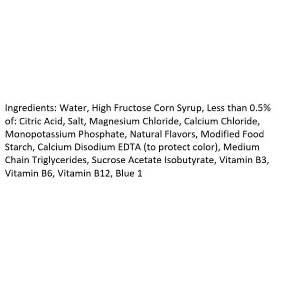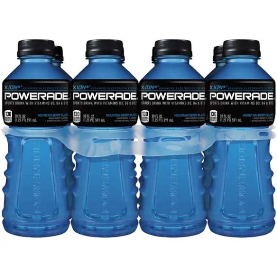 Details Ingredients Water, High Fructose Corn Syrup, Less than 0.5% of: Citric Acid, Salt and Magnesium Chloride and Calcium Chloride and Mono-Potassium Phosphate (Electrolyte Sources), Natural Flavors, Modified Food Starch, Calcium Disodium EDTA (To Protect Color), Medium Chain Triglycerides, Sucrose Acetate Isobutyrate, Vitamin B3 (Niacinamide), Vitamin B6 (Pyridoxine Hydrochloride), Vitamin B12, Blue 1. Show more Product features The ION4 Advanced Electrolyte System helps replenish four electrolytes lost in sweat. Powerade is formulated with a 6% carbohydrate solution to help provide energy to working muscles, and vitamins B3, B6 and B12. Powerade® ION4® Sports Drink With Vitamins B3, B6 & B12 Mountain Berry Blast®.Advanced electrolyte system.Mixed berry flavored + other natural flavors.130 Calories per bottle.20 fl oz (1.25 pt) 591 ml.Kosher Net Quantity of Content 8 X 1.0