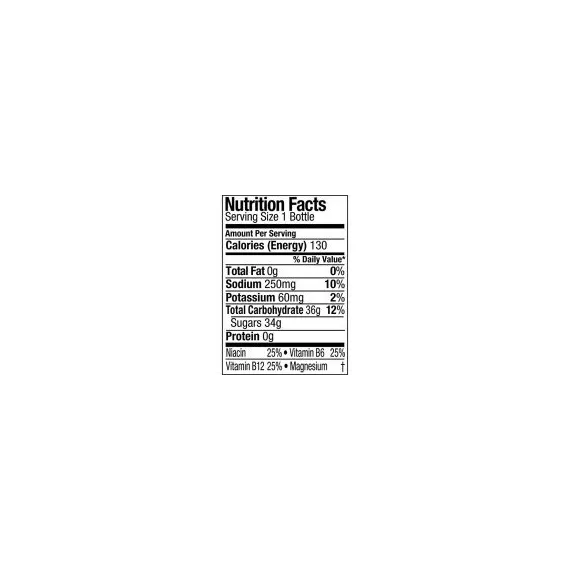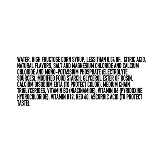 Details Ingredients Water, High Fructose Corn Syrup, less than 0.5% of: Citric Acid, Natural Flavors, Salt and Magnesium Chloride and Calcium Chloride and Mono-Potassium Phosphate (Electrolyte Sources), Modified Food Starch, Glycerol Ester of Rosin, Calcium Disodium EDTA (to protect color), Medium Chain Triglycerides, Vitamin B3 (Niacinamide), Vitamin B6 (Pyridoxine Hydrochloride), Vitamin B12, Red 40, Ascorbic Acid (to protect taste). Show more Product features Powerade ION4 Sports Drink With Vitamins B3, B6 & B12 Fruit Punch - 8 PK. Powerade® ION4® Sports Drink With Vitamins B3, B6 & B12 Fruit Punch. Advanced electrolyte system. Flavored + other natural flavors. 130 calories per bottle. 20 Fl. Oz. (1.25 Pint) 591 ml. Kosher Special Features Natural fruit punch flavors Net Quantity of Content 20 X 1.0
