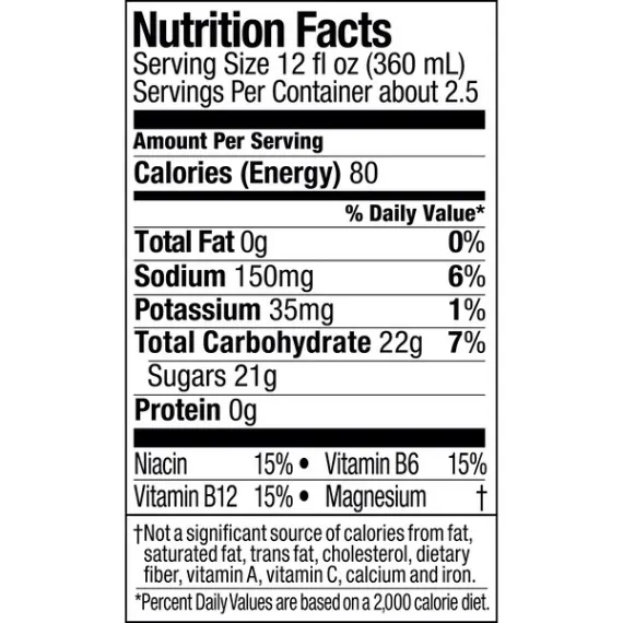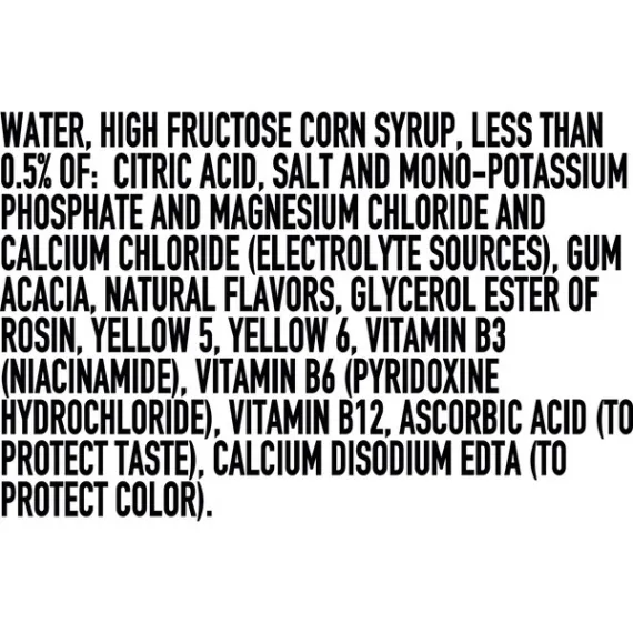 Details Ingredients Water, High Fructose Corn Syrup, Less than 0.5% of: Citric Acid, Salt, Monopotassium Phospate, Magnesium Chloride, Calcium Chloride (Electrolyte), Gum Acacia, Natural Flavors, Glycerol Ester of Rosin, Yellow #5, Yellow #6, Vitamin B3 (Niacinamide), Vitamin B6 (Pyridoxine Hydrochloride), Vitamin B10, Ascorbic Acid (to protect taste), Calcium Disodium EDTA (to protect color) Show more Product features The ION4® Advanced Electrolyte System helps replenish four electrolytes lost in sweat. Powerade® is formulated with a 6% carbohydrate solution to help provide energy to working muscles, and vitamins B3, B6 and B12. Powerade Orange Bottle, 32 fl oz Special Features With b vitamins Net Quantity of Content 1.0 X 32 Oz.
