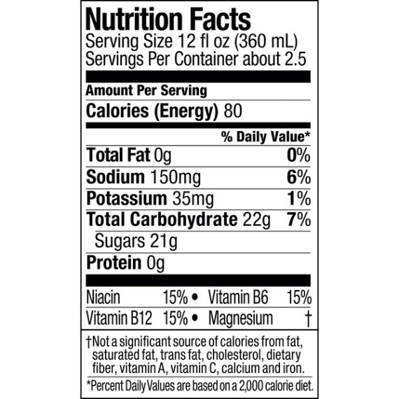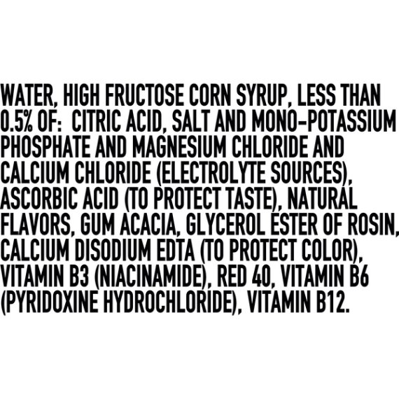 Details Ingredients INGREDIENTS: WATER, HIGH FRUCTOSE CORN SYRUP, LESS THAN 0.5% OF: CITRIC ACID, SALT AND MONO-POTASSIUM PHOSPHATE AND MAGNESIUM CHLORIDE AND CALCIUM CHLORIDE (ELECTROLYTE SOURCES), ASCORBIC ACID (TO PROTECT TASTE), NATURAL FLAVORS, GUM ACACIA, GLYCEROL ESTER OF ROSIN, CALCIUM DISODIUM EDTA (TO PROTECT COLOR), VITAMIN B3 (NIACINAMIDE), RED 40, VITAMIN B6 (PYRIDOXINE HYDROCHLORIDE), VITAMIN B12. Show more Product features The ION4® Advanced Electrolyte System helps replenish four electrolytes lost in sweat. Powerade® is formulated with a 6% carbohydrate solution to help provide energy to working muscles, and vitamins B3, B6 and B12. Powerade Strawberry Lemonade Sports Drink Bottle, 32 fl oz Special Features Advanced electrolyte system Net Quantity of Content 2.5 X 32 Oz.