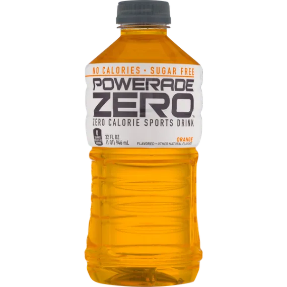 Details Ingredients WATER. LESS THAN 1% OF: CITRIC ACID, SALT AND MONO-POTASSIUM PHOSHAPHATE AND MAGNESIUM CHLORIDE AND CALCIUM CHLORIDE (ELECTROLYTE SOURCES). NATURAL FLAVORS, SUCRALOSE. ACESULFAME POTASSIUM. VITAMIN B3 (NIACINAMIDE). VITAMIN B12. YELLOW 5. YELLOW 6. ASCORBIC ACID (TO PROTECT TASTE). CALCIUM DISODIUM EDTA (TO PROTECT COLOR). Show more Product features Powerade Zero™ Calorie Sports Drink Orange. Flavored with other natural flavors. Helps replenish 4 electrolytes lost in sweat. Contains no calories and free from sugar. Powerade Zero™ Orange Zero Calorie Sports Drink.No calories.Sugar free.0 calories per 12 fl oz serving.Flavored + other natural flavors. Special Features Zero calories Net Quantity of Content ABOUT 2.5 X 12 fl oz