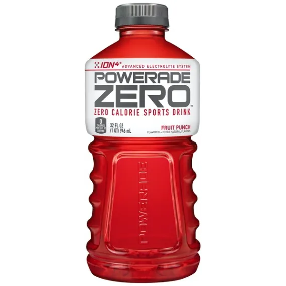 Details Ingredients Water, Less than 1% of: Citric Acid, Salt, Monopotassium Phospate, Magnesium Chloride, Natural Flavors, Natural Flavors, Sucralose, Acesulfame Potassium, Vitamin B3 (Niacinamide), Vitamin B6 (Pyridoxine Hydrochloride), Vitamin B10, Red #38, Ascorbic Acid (to protect taste), Calcium Disodium EDTA (to protect color) Show more Product features The ION4® Advanced Electrolyte System helps replenish four electrolytes lost in sweat. Powerade® is formulated with a 6% carbohydrate solution to help provide energy to working muscles, and vitamins B3, B6 and B12. Powerade Zero Fruit Punch Bottle, 32 fl oz Net Quantity of Content 1.0 X 32 Oz.