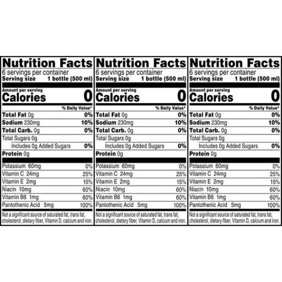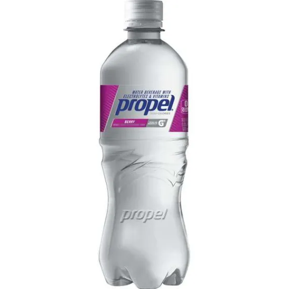 Details Ingredients Berry: Water, Citric Acid, Sodium Hexametaphosphate (to Protect Flavor), Natural Flavor, Salt, Potassium Sorbate (Preserves Freshness), Potassium Citrate, Sodium Citrate, Ascorbic Acid (Vitamin C), Sucralose, Acesulfame Potassium, Calcium Disodium EDTA (to Protect Flavor), Calcium Pantothenate (Vitamin B5), Niacinamide (Vitamin B3), Vitamin E Acetate, Pyridoxine Hydrochloride (Vitamin B6). Kiwi Strawberry: Water, Citric Acid, Sodium Hexametaphosphate (to Protect Flavor), Natural Flavor, Salt, Potassium Sorbate (Preserves Freshness), Potassium Citrate, Sodium Citrate, Ascorbic Acid (Vitamin C), Sucralose, Acesulfame Potassium, Calcium Disodium EDTA (to Protect Flavor), Calcium Pantothenate (Vitamin B5), Niacinamide (Vitamin B3), Vitamin E Acetate, Pyridoxine Hydrochloride (Vitamin B6). Grape: Water, Citric Acid, Sodium Hexametaphosphate (to Protect Flavor), Natural Flavor, Salt, Potassium Sorbate (Preserves Freshness), Potassium Citrate, Sodium Citrate, Ascorbic Acid (Vitamin C), Sucralose, Acesulfame Potassium, Calcium Disodium EDTA (to Protect Flavor), Calcium Pantothenate (Vitamin B5) Niacinamide (Vitamin B3), Vitamin E Acetate, Pyridoxine Hydrochloride (Vitamin B6). Show more Product features Give your workout a boost of fruit flavor. Each Propel provides electrolytes, vitamin B, and antioxidant vitamins C and E, so you can hydrate, replenish and get your best workout without adding calories. Pack includes 6 Berry flavored bottles, 6 Kiwi Strawberry flavored bottles, and 6 Grape flavored bottles. From the makers of Gatorade. When you sweat, you lose more than just water. You lose important electrolytes such as salt and potassium that are important for keeping your body properly hydrated. Propel is the only water with enough electrolytes to put back what you lose in sweat.