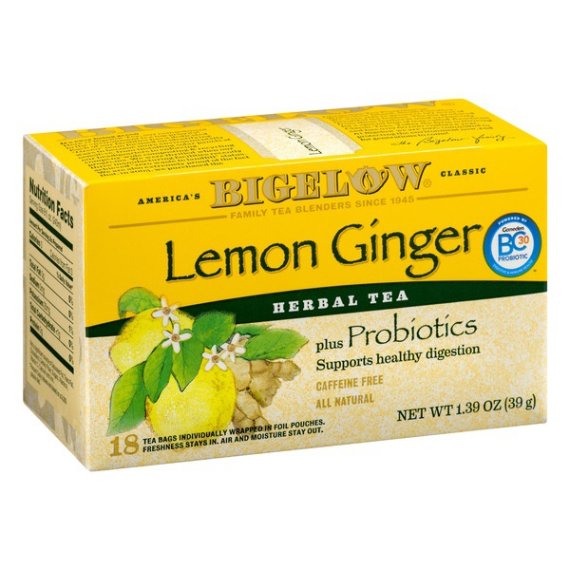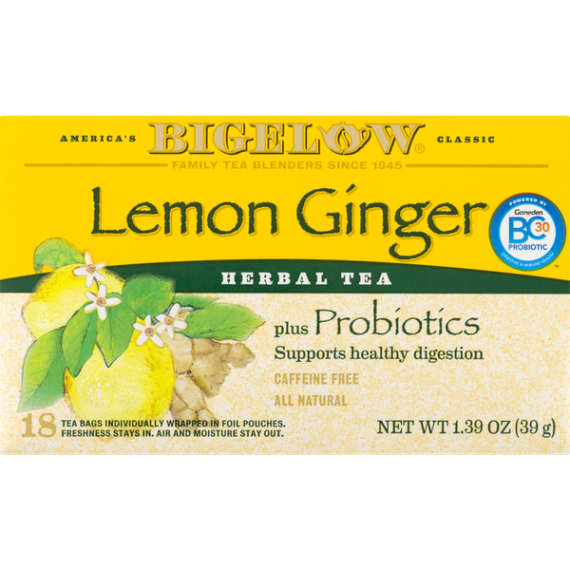 Details Ingredients Lemongrass, Lemon Peel, Cinnamon, Natural Ginger and Lemon Flavors with other Natural Flavors (Soy Lecithin), Lemon Verbena, Rose Hips, Ginger, Licorice Root, GanedenBC30® (Bacillus coagulans GBI-30, 6086), Citric Acid. Show more Product features This recipe not only taste delicious, it's good for your digestion too. Our zesty blend of lemon and ginger has been combined with the probiotic BC 30, an innovation that helps maintain a healthy balance in your digestive tract when used as part of a balanced diet. Herbal Tea, Lemon Ginger, Caffeine Free, Bags 18 tea bags individually wrapped in foil pouches. Freshness stays in. Air and moisture stay out. Plus probiotics. Supports healthy digestion. All natural. Powered by Ganeden BC30 probiotic. Digestive & immune health. Family tea blenders since 1945. It's Easy Being Green: Here at Bigelow Tea, our commitment to the environment is a top priority! Each of our facilities has a dedicated green team focused on identifying ways to become more environmentally sensitive, from installing solar panels at our headquarters to enforcing company-wide composting & recycling programs. We were thrilled when our three manufacturing facilities recently achieved zero waste to landfill status. We are also extremely proud of the fact that, in 2003, we purchased the Charleston Tea Plantation in Wadmalaw Island, South Carolina. We were able to preserve 127 acres of beautiful tea bushes. The tea produced from these bushes is used exclusively for a special line of teas call American Classic Tea. Today the farm is thriving and has over 60,000 visitors a year. At Bigelow we are 100% committed to protecting the environment now, and for generations to come! - The Bigelow Family. Unlock the Freshness - Here's the Key: We use a special foil pouch to protect your tea from any air, moisture and surrounding aromas. So open and enjoy the unparalleled flavor, freshness, aroma of Bigelow Tea everywhere you go! Caff-O-Meter (Represents average caffeine content; individual products may vary): coffee - 100-120 mg; black tea - 30-60 mg; green tea - 25-50 mg; decaf tea - 1-8 mg; herbal tea - 0 mg. Our Promise: We're fully committed to your satisfaction and we love to hear from you! When you do call, please share the code number on this box with the Consumer Service crew. RC Bigelow, Inc; Attn: Consumer Services Group; Fairfield, CT 06825-5512; 1-888-Bigelow; bigelowtea.com. We're Proud of Our Recipe: This recipe not only tastes delicious, it's good for your digestion too. Our zesty blend of lemon and ginger has been combined with the probiotic BC 30, an innovation that helps maintain a healthy balance in your digestive tract when used as part of a balanced diet. Gluten free. Our boxes, tea bags, strings and tags are 100% biodegradable and we encourage you to do your part. Thanks! Blended and packaged in the USA. Special Features