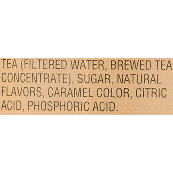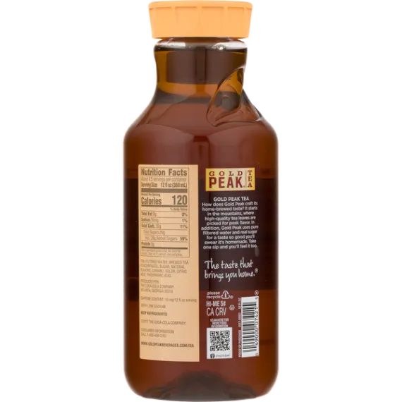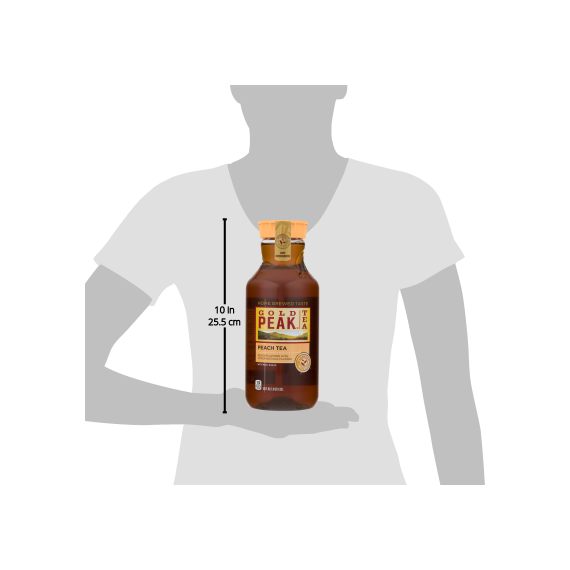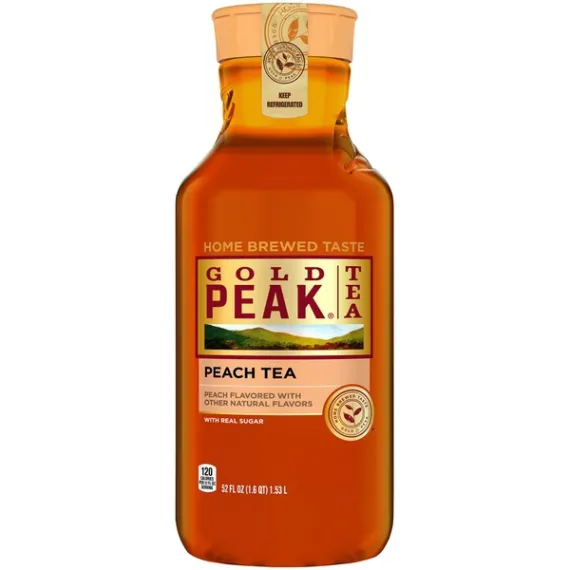 Details Ingredients TEA (FILTERED WATER, BREWED TEA CONCENTRATE), SUGAR, NATURAL FLAVORS, CARAMEL COLOR, CITRIC ACID, PHOSPHORIC ACID. Show more Product features Gold Peak Peach Iced Tea, 52 fluid ounces Gold Peak Peach Tea, 52 fl oz Net Quantity of Content ABOUT 4.5 X 12 fl oz
