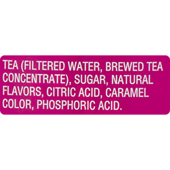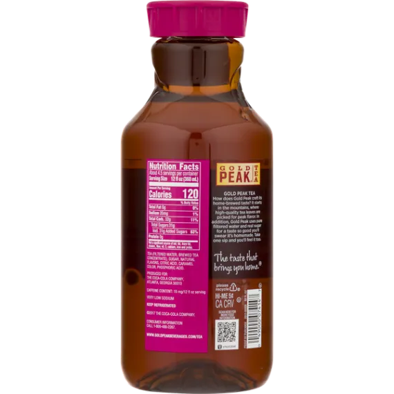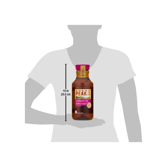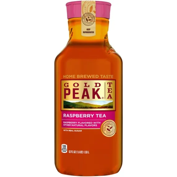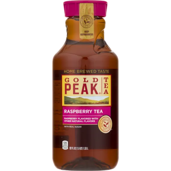 Details Ingredients TEA (FILTERED WATER, BREWED TEA CONCENTRATE), SUGAR, NATURAL FLAVORS, CITRIC ACID, CARAMEL COLOR, PHOSPHORIC ACID. Show more Product features Gold Peak Raspberry Iced Tea, 52 fluid ounces Gold Peak Raspberry Tea, 52 fl oz Net Quantity of Content ABOUT 4.5 X 12 fl oz