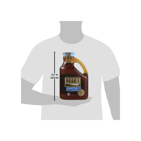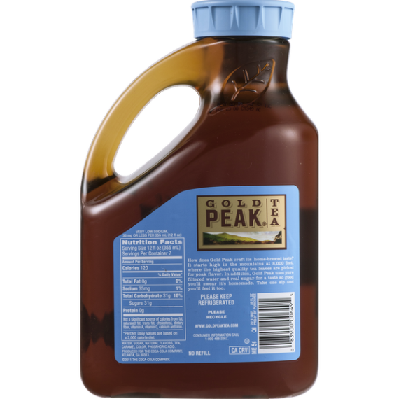 Details Ingredients TEA (FILTERED WATER, BREWED TEA CONCENTRATE), SUGAR, NATURAL FLAVORS. CARAMEL COLOR, PHOSPHORIC ACID. Product features Tea, Sweet, with Real Sugar, Jug 89 OZ With real sugar. Home brewed taste. How does Gold Peak craft its home-brewed taste? It starts high in the mountains at 8,000 feet, where the highest quality tea leaves are picked for peak flavor. In addition, Gold Peak uses pure filtered water and real sugar for a taste so good you'll swear it's homemade. Take one sip and you'll feel it too. The taste that brings you home. Please recycle. Caffeine Content: 15 mg/12 fl oz serving. Consumer information call 1-800-488-2267. www.Goldpeakbeverages.com/Tea. Keep refrigerated. 89 fl oz (2 qt 1 pt 9 fl oz) 2.6 liter Atlanta, GA 30313 800-488-2267 2015 The Coca-Cola Company Sweet Tea With real sugar. Home brewed taste. How does Gold Peak craft its home-brewed taste? It starts high in the mountains at 8,000 feet, where the highest quality tea leaves are picked for peak flavor. In addition, Gold Peak uses pure filtered water and real sugar for a taste so good you'll swear it's homemade. Take one sip and you'll feel it too. The taste that brings you home. Please recycle. Caffeine Content: 15 mg/12 fl oz serving. Consumer information call 1-800-488-2267. www.Goldpeakbeverages.com/Tea. Net Quantity of Content 7 X 12 fl oz