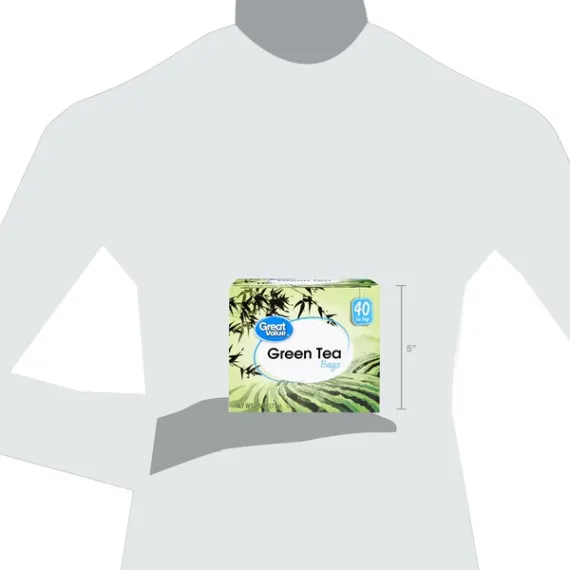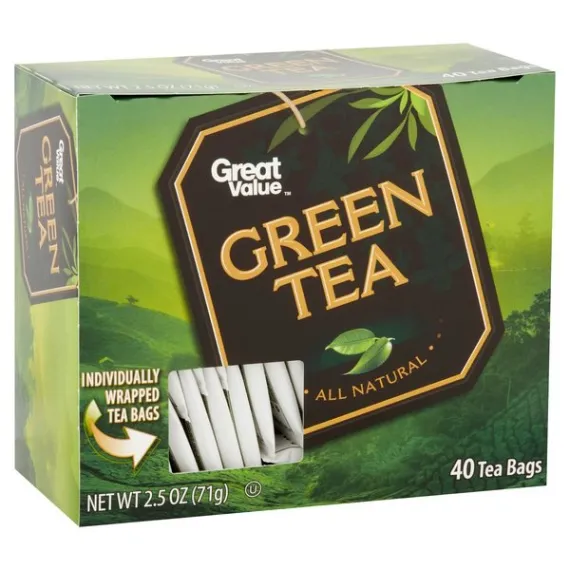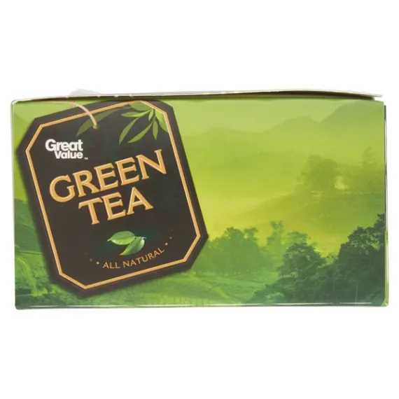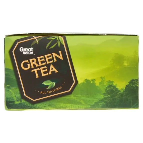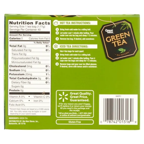 Details Ingredients Green Tea Product features Green Tea Bags Product Features All natural Individually wrapped tea bags Gluten-free Kosher Wal-Mart Stores, Inc., Bentonville, AR, 72716. walmart.com/greatvalue Net Quantity of Content 48 X 1.77 G