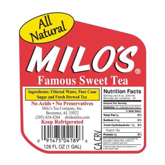Details Ingredients Filtered Water, Pure Cane Sugar and Custom Blended Teas Product features Milo's Famous Sweet Tea is different because it is fresh brewed from custom-blended tea leaves, all natural and contains no preservatives, no additives and no acids. There are only three ingredients in Milo's Famous Sweet Tea: custom-blended teas, filtered water and pure cane sugar. Read the simple ingredient list and you will see the difference. Drink Milo's and taste the difference. Milo's was founded as a restaurant in 1946 by Milo and Bea Carlton after Milo returned from serving our country in World War II. Milo's philosophy was simple use high quality, natural ingredients, listen to your customers and never sacrifice taste. Their vision still guides us today as we source natural ingredients, fresh brew all of our teas and never use added colors or preservatives. Drink Milo's and you will Taste the Difference! Fresh-Brewed from Custom Blended Tea Leaves Fresh-brewed from real tea leaves, which gives Milo's its delicious flavor and is the core of our slogan Taste the Difference All Natural. No Preservatives. No Added Acids. Read the labels of the other drinks out there and see the difference. You will find that most contain preservatives like phosphoric acid, potassium sorbate, citric acid or sodium benzoate. They also likely have additives such as color, stabilizers or texturizers. Read our simple ingredient list and see the difference. Drink Milo's and Taste the Difference! Quality Ingredients From the field to the glass, Milo's sources every ingredient to ensure only the highest quality for our customers. We personally visit the tea and sugar cane fields to make sure that our suppliers provide us with only the best ingredients available. We require all our suppliers to certify that they will adhere to our stringent quality and safety standards, as well as manage rigorous, voluntary programs of our own. Source of Antioxidants All teas green, black or oolong come from the same plant, Camellia sinensis, and are rich in polyphenols. According to John Weisburger PhD, senior researcher at the Institute for Cancer Prevention in Valhalla, NY, these polyphenols are a type of antioxidant that seeks out cell damaging free radicals in our bodies and renders them harmless. This is often referred to as detoxification. Dr. Weisburger says, In my lab, we found that green and black tea had identical amounts of polyphenols. Weisburger's researchers also concluded that both green and black teas have about 8 to 10 times the polyphenols found in fruits and vegetables. There are many additional studies that attribute health benefits to the antioxidants found in tea. Because Milo's Tea is fresh brewed, it has even higher antioxidant levels than most Global Tea Championship The Global Tea Championship, formerly North American Tea Championship, is an independent competition, judged by tea professionals, to distinguish the highest quality & best tasting teas commercially available. Milo's has won or placed in the Tea Championships for 7 years and counting. Net Quantity of Content 16 X 8 fl oz