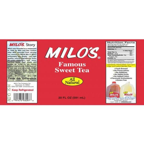 Details Ingredients Filtered Water, Pure Cane Sugar and Custom Blended Teas. Product features Milo's Famous Sweet Tea is fresh brewed from custom-blended tea leaves,it is all natural and contains no preservatives, no additives and no acids. There are only three ingredients in Milo's Famous Sweet Tea: custom-blended teas, filtered water and pure cane sugar. Read the simple ingredient list and you will see the difference. Drink Milo's and taste the difference. Milo's was founded as a restaurant in 1946 by Milo and Bea Carlton after Milo returned from serving our country in World War II. Milo's philosophy was simple use high quality, natural ingredients, listen to your customers and never sacrifice taste. Their vision still guides us today as we source natural ingredients, fresh brew all of our teas and never use added colors or preservatives. Drink Milo's and you will Taste the Difference! Fresh-Brewed from Custom Blended Tea Leaves Fresh-brewed from real tea leaves, which gives Milo's its delicious flavor and is the core of our slogan Taste the Difference All Natural. No Preservatives. No Added Acids. Read the labels of the other drinks out there and see the difference. You will find that most contain preservatives like phosphoric acid, potassium sorbate, citric acid or sodium benzoate. They also likely have additives such as color, stabilizers or texturizers. Read our simple ingredient list and see the difference. Drink Milo's and Taste the Difference! Quality Ingredients From the field to the glass, Milo's sources every ingredient to ensure only the highest quality for our customers. We personally visit the tea and sugar cane fields to make sure that our suppliers provide us with only the best ingredients available. We require all our suppliers to certify that they will adhere to our stringent quality and safety standards, as well as manage rigorous, voluntary programs of our own. Source of Antioxidants All teas green, black or oolong come from the same plant, Camellia sinensis, and are rich in polyphenols. According to John Weisburger PhD, senior researcher at the Institute for Cancer Prevention in Valhalla, NY, these polyphenols are a type of antioxidant that seeks out cell damaging free radicals in our bodies and renders them harmless. This is often referred to as detoxification. Dr. Weisburger says, In my lab, we found that green and black tea had identical amounts of polyphenols. Weisburger's researchers also concluded that both green and black teas have about 8 to 10 times the polyphenols found in fruits and vegetables. There are many additional studies that attribute health benefits to the antioxidants found in tea. Because Milo's Tea is fresh brewed, it has even higher antioxidant levels than most Global Tea Championship The Global Tea Championship, formerly North American Tea Championship, is an independent competition, judged by tea professionals, to distinguish the highest quality & best tasting teas commercially available. Milo's has won or placed in the Tea Championships for 7 years and counting. Net Quantity of Content 1.5 X 8 fl. oz.