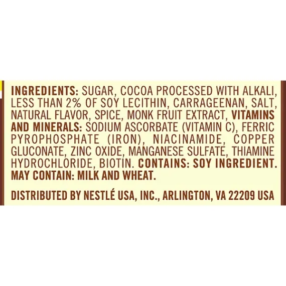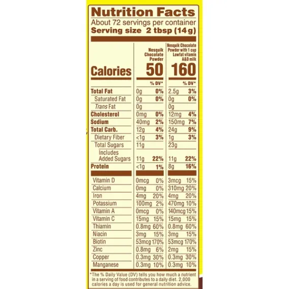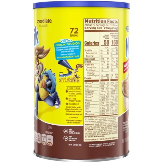 Details Ingredients Sugar, Cocoa Processed with Alkali, Less than 2% of Soy Lecithin, Carrageenan, Salt, Natural Flavor, Spice, Monk Fruit Extract. Vitamins and Minerals: Sodium Ascorbate (Vitamin C), Ferric Pyrophosphate (Iron), Niacinamide, Copper Gluconate, Zinc Oxide, Manganese Sulfate, Thiamine Hydrochloride, Biotin. Show more Product features NESQUIK Chocolate Powder turns milk into an irresistibly delicious and nutritious drink for your family to enjoy and for you to feel good about, with 45% less sugar than the leading syrup brand. NESQUIK Chocolate Powder provides calcium, 8 grams of protein, and 7 essential vitamins and minerals when combined with low-fat milk to help them start the day. NESQUIK Chocolate Powder has 45% Less Sugar than the leading syrup brand. (11g vs. 20g sugar/svg. 23g total sugar when mixed with 1 cup of low fat milk.) A good source of 7 essential vitamins and minerals. 8 grams of protein when combined with low-fat milk. No Artificial Colors or Flavors. Added Color from Natural Sources No High Fructose Corn Syrup. 99.9% Caffeine Free. Kosher. NESQUIK Powder is also available in delicious strawberry flavor. Special Features 25% less sugar than other brands Net Quantity of Content 72.0 X 2 Tbsp. (14g) Chocolate Nesquik