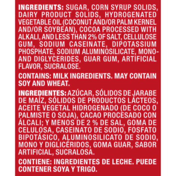 Details Ingredients Sugar, Corn Syrup Solids, Dairy Product Solids, Hydrogenated Vegetable Oil (Coconut and/or Palm Kernel and/or Soybean), Cocoa Processed with Alkali, and Less Than 2% of Salt, Cellulose Gum, Sodium Caseinate, Dipotassium Phosphate, Sodium Aluminosilicate, Mono-and Diglycerides, Guar Gum, Artificial Flavor, Sucralose. Show more Product features Over 100 years of making chocolatey memories. NESTLE Hot Cocoa is made with real Nestle cocoa and is a good source of calcium to support strong bones. Kosher Dairy 6 on-the-go, single-serve envelopes Contains 30% of the recommended daily value of Calcium per serving Made with real, delicious NESTLE Cocoa Net Quantity of Content 6.0 X 1 Packet (20g)