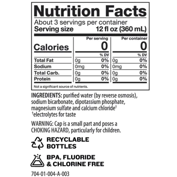 Details Ingredients PURIFIED WATER (BY REVERSE OSMOSIS), SODIUM BICARBONATE, DIPOTASSIUM PHOSPHATE, MAGNESIUM SULFATE AND CALCIUM CHLORIDE? Show more Product features o Essentia’s recyclable, BPA-free plastic water bottles invite users to drink up more of life while benefiting the planet. A bottle of Essentia Water is perfect for those on the go moments when in need of better rehydration*. With a 1-L bottle there’s enough to go around, share with coworkers, friends, teammates or family. For 20 years, Essentia Water has pioneered ionized alkaline water for better rehydration* through a unique, proprietary ionization process that develops supercharged, alkaline water that keeps you ready for anything. Essentia is The Future of Water with their innovative process using water from ordinary sources around the world, significantly reducing transportation and environmental impact, to create extraordinary drinking water for better rehydration*. With passion and purpose, Essentia Nation strives to reach people around the world, unlocking their raw potential to do more, believe more and achieve more. *Based on a 2014 hydration study. More at essentiawater.com. o Supercharged with electrolytes for a smooth taste; Essentia Water delivers overachieving H2O for the doers, the believers and the overachievers. o Essentia’s innovative, proprietary filtration process removes bitter-tasting acidic ions, producing a smooth, fresh alkaline bottled water with a 9.5 pH or higher. o Essentia Water is infused with trace amounts of pure alkaline minerals and electrolytes for taste; clean and smooth, containing calcium, magnesium, sodium bicarbonate and potassium. o Available in convenient packaging; ionized hydration is easy to keep on hand for the sports team, family or business meeting; a 1-liter bottle ensures better rehydration*. o Refresh, reenergize, reinvigorate the whole team with purified Essentia drinking water; for handy workout rehydration, stock a few at the court, gym, field, track, studio, bench and sidelines. o BPA-free, recyclable, portable plastic water bottles ensure effortless, on-the-go convenience; keep the gym, dorm room, fitness studio and car well supplied with generous 1-Liter bottle. o Whether circling the table for a conference, pulling an all-nighter with study partners or lifting weights at the gym, Essentia Water helps users increase their potential through better rehydration*. o Essentia believes that supercharged rehydration is critical for performing, competing and creating at that stellar level that goes above and beyond; live passionately and unlock full potential. o Essentia Water contains important trace minerals, such as potassium, and electrolytes for a clean and smooth taste; with Essentia Water you can Drink Up More of Life. o Gleaned from water sources around the world, Essentia Water is committed to caring for the planet and its people; reduced resource transportation means less impact on the environment. o Big drinks satisfy that big thirst for life; 1-liter bottle with screw cap lids is pure, refreshing satisfaction while working, hiking, running, biking, climbing, jogging or walking. o Purified, pH drinking at its finest; refillable plastic bottles with striking Essentia Water logo; celebrating the possible, the peak, the perfection and the performance of people everywhere. o Embrace better ionized rehydration* and join the proud Essentia Nation; be a part of The Future of Water, live extraordinarily and drink in all the adventure life has to offer. *Results of a double-blind, placebo controlled clinical study with Essentia Water vs. a leading bottled water in healthy subjects over two hours following moderate aerobic exercise Net Quantity of Content ABOUT 3 X 12 fl oz