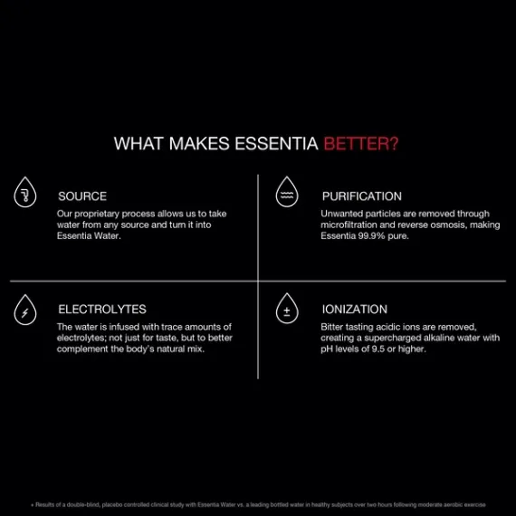 Essentia Water; 1 Liter Bottle; Ionized Alkaline Bottled Water; Electrolytes for Taste; Better Rehydration*; pH 9.5 or Higher; Pure Drinking Water; For the Doers, the Believers, the Overachievers