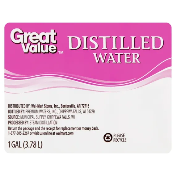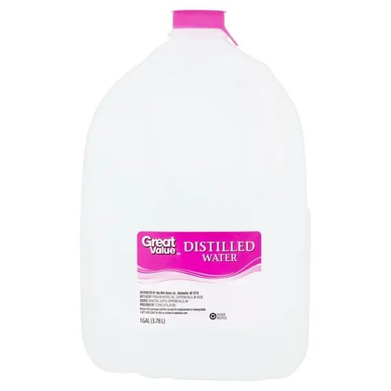 Details Ingredients Distilled water Product features Great Value Distilled Water has a variety of uses. Distilled water is a great choice for use in your steam irons and humidifiers in your home. Great Value Distilled Water is also ideal for watering your household plants and can be used in your fresh-water aquarium. It is ideal for usage in small appliances or certain scientific activities. You are assured of its quality as it is purified by steam distillation. With its 1-gallon capacity, you can fill up multiple bottles or containers with a single purchase of this Great Value Distilled Water.Great Value products provide families with affordable, high-quality grocery and household consumable options. With our wide range of product categories spanning grocery and household consumables, we offer you a variety of products for your family's needs. Our products are conveniently available online and in Walmart stores nationwide, allowing you to stock up and save money at the same time. Great Value Distilled Water, 1 gal:Purified distilled waterPurified by steam distillationSize: 1 gallon Net Quantity of Content 16 X 240 mL