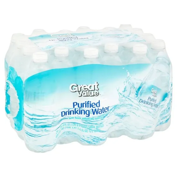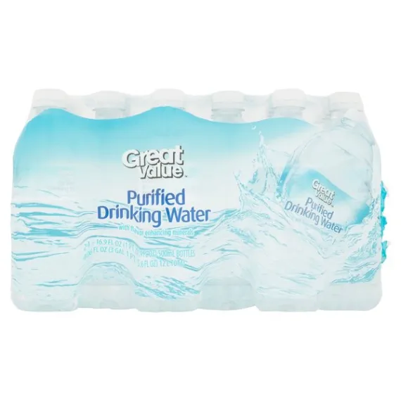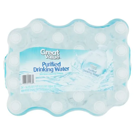 Details Ingredients Water Product features Stay hydrated with Great Value Purified Drinking Water. This purified drinking water contains minerals that have been added to give it a pure, crisp, clean and refreshing taste. This bottled drinking water is ideal for taking with you to work, school, the gym, a run or jog, while on the go and more. Each of these 0.5 liter bottles is made of recyclable material. There are 24 bottles of purified drinking water in this package so you will have enough for lunchboxes, soccer practice and home. Wherever you go, stay refreshed and healthy with this Great Value Purified Drinking Water.Great Value products provide families with affordable, high-quality grocery and household consumable options. With our wide range of product categories spanning grocery and household consumables, we offer you a variety of products for your family's needs. Our products are conveniently available online and in Walmart stores nationwide, allowing you to stock up and save money at the same time. Great Value Purified Drinking Water, 16.9 fl oz, 24 Count:With flavor-enhancing minerals24, 0.5 liter bottlesBottles are recyclable Special Features Flavor enhancing minerals Net Quantity of Content 2 X 8 fl oz