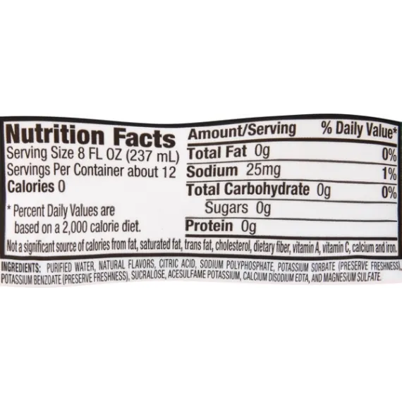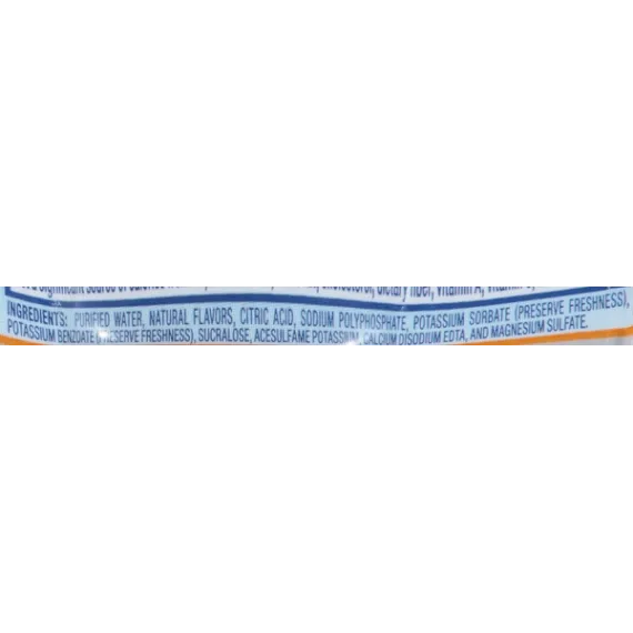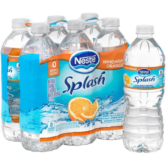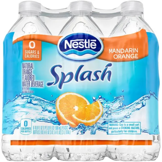 Details Ingredients Purified Water, Natural Flavors, Citric Acid, Sodium Polyphosphate, Potassium Sorbate (Preserve Freshness), Potassium Benzoate (Preserve Freshness), Sucralose, Acesulfame Potassium, Calcium Disodium EDTA, Magnesium Sulfate. Show more Product features It’s fun to stay hydrated with Mandarin Orange Nestle Splash, bursting with the fresh citrus flavor of mandarin oranges. Nestle Splash is a blend of purified water, light sweetness and natural fruit flavor. This thirst-quenching bottled beverage is also a smart alternative to sugary drinks, with no sugar and zero calories. Try all five refreshing varieties, and add a splash of flavor to your family’s daily hydration. 16.9-ounce/.5-Liter plastic bottles, perfect to take for lunch or bring to work6-Pack: enjoy with lunch all week longA light splash of natural mandarin orange fruit flavors makes it fun to stay hydratedContains zero-calorie sweeteners, so you get all the enjoyment but none of the caloriesA smart alternative to sugared beverages Net Quantity of Content 12.0 X 8 fl. oz. (237mL)
