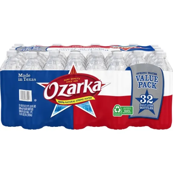 Details Ingredients Source: Piney Woods Spring, Wood County, TX and/or Moffit Spring, Walker County, TX and/or Roher Spring, Henderson County, TX. Product features Ozarka Brand 100% Natural Spring Water, established in 1905, has been a local favorite for generations. Sourced from carefully selected springs in Texas, Ozarka spring water contains naturally occurring minerals for a crisp, refreshing taste. So when you’re looking for a trusted source of hydration for any occasion, choose OZARKA. 32-Pack is Great for Parties and Family Stock-Up16.9 oz. /.5L Plastic Bottle: Easy to Take Along in a Purse or Backpack Special Features Pure quality sine 1905. Our commitment: conserving natural habitats; managing water resources for the future. 30% less plastic (bottle contains on average 30% less plastic versus comparable size carbonated and non-carbonated beverages). Be green. Good news - all Ozarka bottles can be recycled. But did you know that fewer than 25% of all plastic bottles actually are recycled? We need your help. Please recycle. Be healthy. A typical 12 oz sugared beverage contains the equivalent of 10 tsp of sugar. Water has no sugar. Replace one sugared beverage daily with water and cut 3,650 tsp of sugar a year from your diet. Be assured. Our water's original quality and natural blend of minerals are sealed in the bottle so you can enjoy its clean, crisp taste and natural spring goodness.