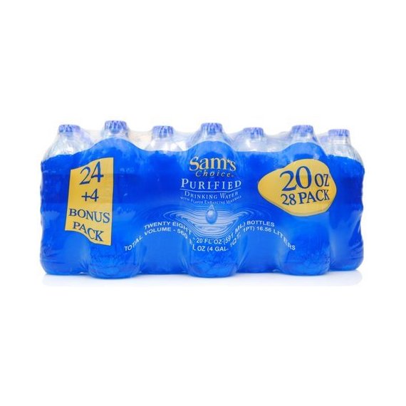 Details Ingredients Purified Water, Magnesium Sulfate, Potassium Bicarbonate, Potassium Chloride. Product features Enjoy fresh water on the go with Sam's Choice Purified Drinking Water (20 fl oz., 28-count). This beverage is sodium-free and contains flavor-enhancing minerals. Take this purified water with you on your next workout and stay hydrated.Sam's Choice Purified Drinking Water: With flavor-enhancing mineralsSam's Choice Water is sodium-free20 oz. bottlesConvenient for on the go Net Quantity of Content 70 X 240 ml