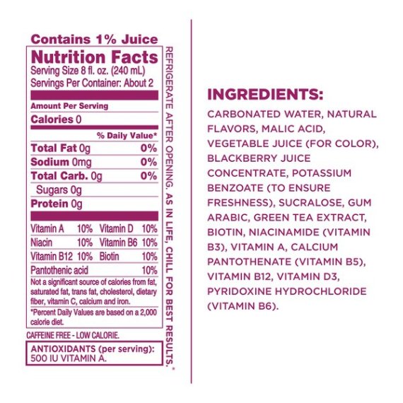 Details Ingredients CARBONATED WATER, NATURAL FLAVORS, MALIC ACID, VEGETABLE JUICE (FOR COLOR), BLACKBERRY JUICE CONCENTRATE, POTASSIUM BENZOATE (TO ENSURE FRESHNESS), SUCRALOSE, GUM ARABIC, GREEN TEA EXTRACT, BIOTIN, NIACINAMIDE (VITAMIN B3), VITAMIN A, CALCIUM PANTOTHENATE (VITAMIN B5), VITAMIN B12, VITAMIN D3, PYRIDOXINE HYDROCHLORIDE (VITAMIN B6) Show more Product features Sparkling Ice® is a fizzy and flavorful sparkling water—without all the calories. This best-selling, succulent flavor makes for one sweet experience. We call it Black Raspberry, but you can call it delicious. Bursting with real fruit flavor Put a little fizz in your day Zero Sugar Zero calories, Zero guilt Contains Antioxidants and Vitamins Contains 1% Juice Net Quantity of Content ABOUT 24 X 8 Fluid Ounces