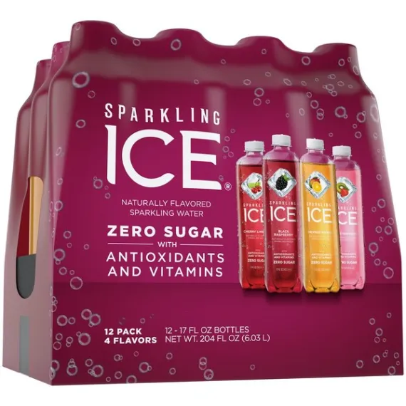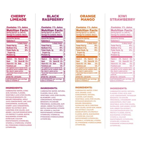 Details Ingredients BLACK RASPBERRY INGREDIENTS: CARBONATED WATER, NATURAL FLAVORS, MALIC ACID, VEGETABLE JUICE (FOR COLOR), BLACKBERRY JUICE CONCENTRATE, POTASSIUM BENZOATE (TO ENSURE FRESHNESS), SUCRALOSE, GUM ARABIC, GREEN TEA EXTRACT, BIOTIN, NIACINAMIDE (VITAMIN B3), VITAMIN A, CALCIUM PANTOTHENATE (VITAMIN B5), VITAMIN B12, VITAMIN D3, PYRIDOXINE HYDROCHLORIDE (VITAMIN B6) CHERRY LIMEADE INGREDIENTS: CARBONATED WATER, CITRIC ACID, NATURAL FLAVORS, VEGETABLE JUICE (FOR COLOR), POTASSIUM BENZOATE (TO ENSURE FRESHNESS), APPLE JUICE CONCENTRATE, LIME JUICE CONCENTRATE, SUCRALOSE, CHERRY JUICE CONCENTRATE, GREEN TEA EXTRACT, BETA CAROTENE (FOR COLOR), GUM ARABIC, CALCIUM DISODIUM EDTA (TO PROTECT FLAVOR), BIOTIN, NIACINAMIDE (VITAMIN B3), ESTER GUM, CALCIUM PANTOTHENATE (VITAMIN B5), VITAMIN A, VITAMIN B12, VITAMIN D3, PYRIDOXINE HYDROCHLORIDE (VITAMIN B6) ORANGE MANGO INGREDIENTS: CARBONATED WATER, CITRIC ACID, ORANGE JUICE CONCENTRATE, NATURAL FLAVORS, GUM ARABIC, VEGETABLE JUICE (FOR COLOR), POTASSIUM BENZOATE (TO ENSURE FRESHNESS), SUCRALOSE, BETA CAROTENE (FOR COLOR), ESTER GUM, GREEN TEA EXTRACT, CALCIUM DISODIUM EDTA (TO PROTECT FLAVOR), BIOTIN, NIACINAMIDE (VITAMIN B3), CALCIUM PANTOTHENATE (VITAMIN B5), VITAMIN A, VITAMIN B12, VITAMIN D3, PYRIDOXINE HYDROCHLORIDE (VITAMIN B6) KIWI STRAWBERRY INGREDIENTS: CARBONATED WATER, NATURAL FLAVORS, CITRIC ACID, KIWI JUICE CONCENTRATE, POTASSIUM BENZOATE (TO ENSURE FRESHNESS), STRAWBERRY JUICE CONCENTRATE, FRUIT AND VEGETABLE JUICE (FOR COLOR), SUCRALOSE, ESTER GUM, GREEN TEA EXTRACT, CALCIUM DISODIUM EDTA (TO PROTECT FLAVOR), BIOTIN, NIACINAMIDE (VITAMIN B3), VITAMIN A, CALCIUM PANTOTHENATE (VITAMIN B5), VITAMIN B12, VITAMIN D3, PYRIDOXINE HYDROCHLORIDE (VITAMIN B6) Show more Product features This Sparkling Ice® variety pack is the stuff legends are made of. It’s deliciously bold and refreshingly flavorful without any sugar or calories. And It packs the perfect combination of sweet, tart, and a-ma-zing in four flavors of epic proportions. Bursting with real fruit flavor Put a little fizz in your day Zero Sugar Zero calories, Zero guilt Contains Antioxidants and Vitamins Contains 1% Juice Net Quantity of Content 24 X 8 Fluid Ounces
