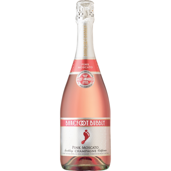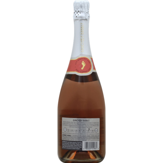 Details Ingredients Pink Moscato Champagne Sparkling Wine (Aromas of Red Apples, Cherries and Sulfites). Product features Barefoot Bubbly Pink Moscato has aromas of jasmine and mandarin orange, complemented by hints of red raspberry, strawberry and pomegranate. BF BUBBLY PINK Special Features Charmat method sparkling wine secondary fermentation prior to bottling. Deliciously sweet. Consistent quality. Proven value. Barefoot Bubbly Pink Moscato California Moscato California Champagne is surprised and delight at first sip! This Pink Moscato sparkler has aromas of red apples and cherries, complemented by a luscious, lingering sweet finish. Enjoy with fresh fruits, white cheeses and sorbet. Alc. 9.5% by vol. Produced & bottled by Barefoot Cellars, Modesto, CA.