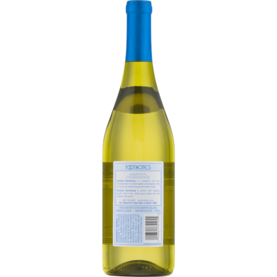 Details Ingredients Green Apple Flavors and Peaches Flavors, Honey, Vanilla. Product features Barefoot Chardonnay has flavors of honeyed peach and Fuji apple. Best Buy Wine Enthusiast April 2006 Market Watch hot brand of the year California, USA 13.0% alcohol by volume Barefoot Cellars Chardonnay Table Wine has a buttery smooth taste of an orchard full of green apples with just a bit of honey. Special Features Critics gold medal
