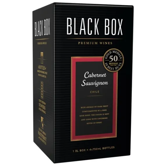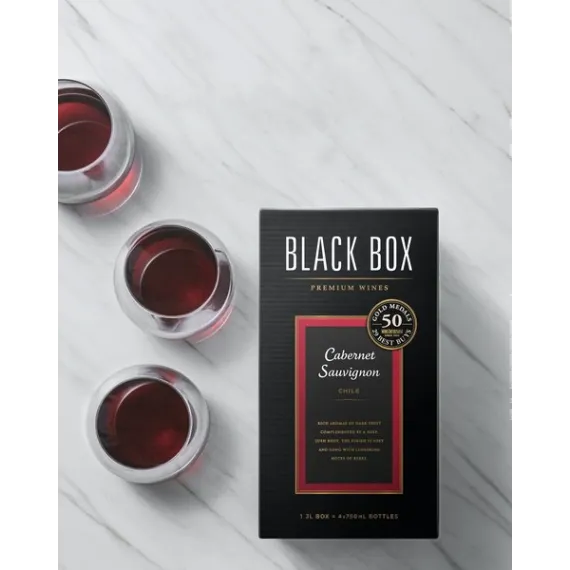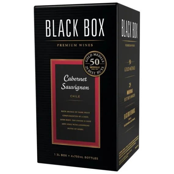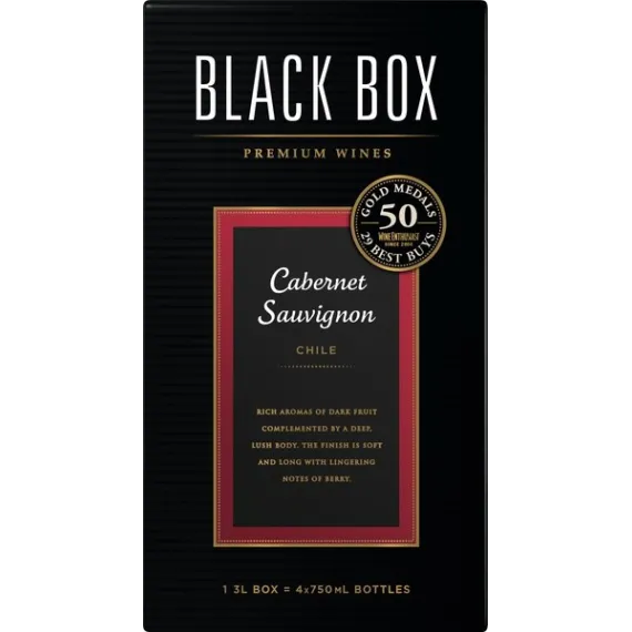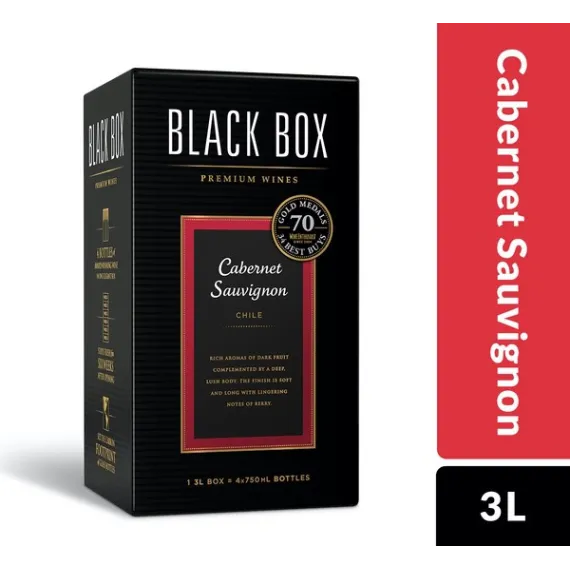 Details Product features Made from grapes harvested in world-class appellations, Black Box Wines have won over 70 Gold Medals at wine competitions throughout the US and have been awarded over 34 Wine Enthusiast Best Buys. Through a meticulous winemaking process, each of our wines is crafted to be food-friendly, fruit-forward and easy-to-drink. One 3-liter box contains the same amount of wine as four 750ml bottles, is 40% less expensive than comparable bottled wines, and stays fresh for six weeks after opening. Our award-winning Cabernet Sauvignon is full-bodied & smooth with aromas of black currant, oak, and vanilla, balanced tannins, and blackberry and chocolate flavors that lead to a soft finish. Pair this smooth red wine with grilled meats or Italian dishes. Ripe blackberries and chocolate fill the palate with balanced tannins Soft, lingering finish Pairs well with filet mignon, braised ribs, or mushroom pizza Stays fresh for 6 weeks after opening, one 3L box = four 750 ml bottles 70 Gold Medals and 40% less expensive than comparable bottled wines Special Features Soft tannins