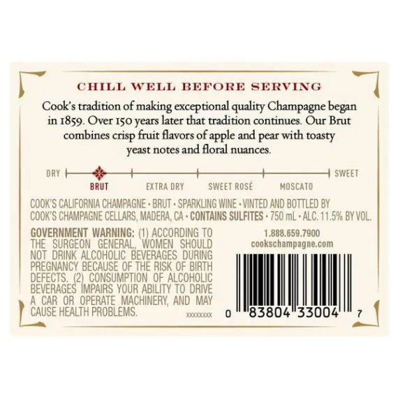 Details Ingredients NA Product features Cook’s California Champagne is produced at the Mission Bell Winery in Madera, California. Cook’s began in 1859 when Isaac Cook created the first American champagne. Cook's wines have been continuing the tradition of being quality champagnes ever since. Fruity and fresh, this medium-dry Prosecco-style sparkling wine features ripe aromas and flavors of apple and pear balanced by toasty yeast and floral nuances. Cook's California Champagne sparkling wines are perfect for every celebration. Best served chill. Fruity and fresh, medium-dry Prosecco-style sparkling wine Aromas and flavors of apple and pear balanced by toasty yeast and florals Best served chilled Produced at the Mission Bell Winery in Madera, California Continuing a tradition of creating quality champagnes since 1859