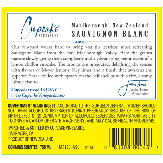 Details Ingredients Sauvignon Blanc, Sulfites. Product features Cupcake Vineyards' Sauvignon Blanc is a vibrant, crisp wine that comes from vineyards in the South Island of New Zealand, where the cool growing season allows our grapes to mature slowly and gain character and complexity. We work with growers in the Wairau and Awatere Valleys to explore the different soil profiles of the region for maximum complexity. The grapes are then harvested at night and promptly pressed to undergo cool fermentation in 100% stainless steel tanks. An extended fermentation sur lie adds richness, complementing the fruit’s natural zest and acidity. This bright wine has flavors of Meyer lemon, white nectarine and Key lime that integrate with subtle hints of grapefruit, gooseberry and citrus, culminating into a long, balanced finish. Pair oysters on the half shell, creamy lobster risotto or a picnic in the park. This bright wine has flavors of Meyer lemon, white nectarine and Key lime that integrate with subtle hints of grapefruit, gooseberry and citrus, culminating into a long, balanced finish. Cupcake Vineyards' Sauvignon Blanc is a vibrant, crisp wine that comes from vineyards in the South Island of New Zealand, where the cool growing season allows our grapes to mature slowly and gain character and complexity. Pair oysters on the half shell, creamy lobster risotto or a picnic in the park. From Marlborough, New Zealand GOLD, Best Buy, Beverage Tastings Institute