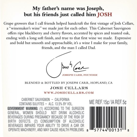 Details Product features Josh Cellars Cabernet Sauvignon. The wine that started it all: our bold yet approachable Cabernet Sauvignon is round and juicy with flavors of blackberry, toasted hazelnut and cinnamon. Josh Cellars Cabernet Sauvignon Wine, 750 mL: Our Cabernet Sauvignon was the first wine we made. This is the wine that started it all, setting the exacting standards that we hold ourselves to for all of our varietals. Round and juicy, our Cabernet Sauvignon has flavors of blackberry, toasted hazelnut and cinnamon, complemented by hints of vanilla and toasted oak. We love pairing this wine with well-seasoned meats like beef, pork, or lamb, and indulgent chocolate desserts. “Our Cabernet Sauvignon is bold yet approachable, like my dad, Josh.” – Joseph Carr Founder, Josh Cellars Special Features My father's name was Joseph, as is mine, but his friends just called him Josh. Growers, that I call friends, all lend a hand in this winemakers wine, what we jokingly refer to as a vin de garage; a handcrafted wine we made just for ourselves. This Cabernet Sauvignon offers ripe black currant flavors, and deep dark fruit nuances, accented by spice and smoke, matched with a long soft finish. A wine that is bold and expressive but unassuming, and approachable. It's funny how these characteristics seem to remind me of someone that I knew. It's wine I made for my family, my friends, and a man I called Dad. North coast. Alc. 14.1% by vol. Blended & bottled by Joseph Carr, St. Helena, CA.