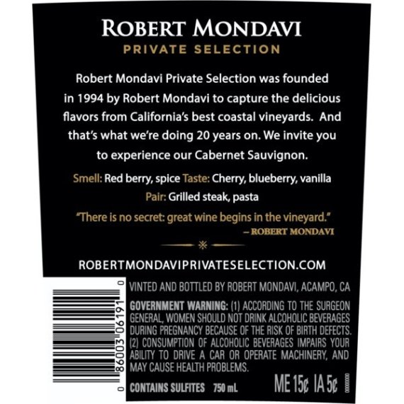 Details Ingredients Smell: Red Berry, Spice.Taste: Cherry, Blueberry, Vanilla.Pair: Grilled Steak, Pasta. Product features Robert Mondavi Private Selection was founded in 1994 by Robert Mondavi to capture the delicious flavors from California's best coastal vineyards. He inherently recognized the Central Coast's potential to produce phenomenal grapes - and, ultimately, wines of the utmost quality - at a more accessible price. They exude the fresh fruit character and bright acidity that can only come from a wine by the influence of the Pacific Ocean. This cabernet sauvignon has flavors of ripe Bing cherries, blackberries, and plum with vanilla, toasty oak, and hints of coffee. It has aromas of red berry and spice, juicy cherry, black current and black pepper. This red wine pairs well with roasted or grilled meats, hearty pasta, and strong cheese. Flavors of ripe Bing cherries, blackberries, and plum with vanilla, toasty oak, and hints of coffee Aromas of red berry and spice, juicy cherry, black current and black pepper Pairs well with roasted or grilled meats, hearty pasta, and strong cheese Delicious grapes give Robert Mondavi wines a distinctive character and intense flavor Pure fruit flavors unique to California coastal vineyards Special Features Since 1994. Follow your passion. Pour in your heart and soul. Settle for nothing less than excellence. - Robert Mondavi. Winemaker Rick Boyer shares Mr. Mondavi's passion for excellence and has crafted this Cabernet Sauvignon from our premium Central Coast vineyards to accent flavors of blackberry and plum, rounded out with a smooth oak finish. Settle for nothing less than excellence on facebook.com/robertmondaviprivateselection. Alc. 13.5% by Vol. Vinted and bottled by Robert Mondavi, Acampo, CA.