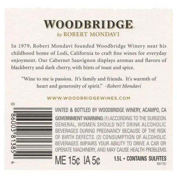 Details Ingredients NA Product features As the central valley heats up, cool maritime breezes are drawn across Woodbridge's Lodi region winery creating a Mediterranean-like climate of warm days and cool nights ideal for growing premium grapes. By using modern technology for winemaking, employing unique growing techniques, and cultivating relationships with the local growers, Woodbridge is able to help ensure high quality grapes that would produce excellent wines. Woodbridge by Robert Mondavi Cabernet Sauvignon opens with aromas of cherries, berries, cedar, brown sugar, and toast. Flavors of berries, toasted marshmallow, chocolate, and graham cracker follow with a toasty caramel finish. This medium-bodied red wine pairs deliciously with grilled meats and tomato-based pasta dishes. Wines for everyday enjoyment, since 1979 Aromas of cherries, berries, cedar, brown sugar, and toast Flavors of berries, toasted marshmallow, chocolate, graham cracker and toasty caramel finish Medium-bodied wine pairs deliciously with grilled meats and tomato-based pasta dishes Winemaking using modern technology and unique growing techniques Wines for everyday enjoyment, since 1979