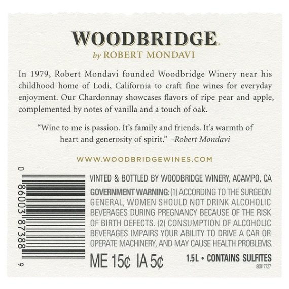Details Ingredients NA Product features As the central valley heats up, cool maritime breezes are drawn across Woodbridge's Lodi region winery creating a Mediterranean-like climate of warm days and cool nights ideal for growing premium grapes. By using modern technology for winemaking, employing unique growing techniques, and cultivating relationships with the local growers, Woodbridge is able to help ensure high quality grapes that would produce excellent wines. Woodbridge by Robert Mondavi Chardonnay displays aromas of tropical fruit with a hint of cinnamon and maple, leading to a rich, toasty finish. This vibrant, medium-bodied white wine pairs well with appetizers, including grilled summer vegetables and fresh fruits. Wines for everyday enjoyment, since 1979. Aromas of tropical fruit with a hint of cinnamon and maple Vibrant, medium-bodied wine , with a rich, toasty finish Pairs with appetizers, including grilled summer vegetables and fresh fruits Winemaking using modern technology and unique growing techniques Wines for everyday enjoyment, since 1979