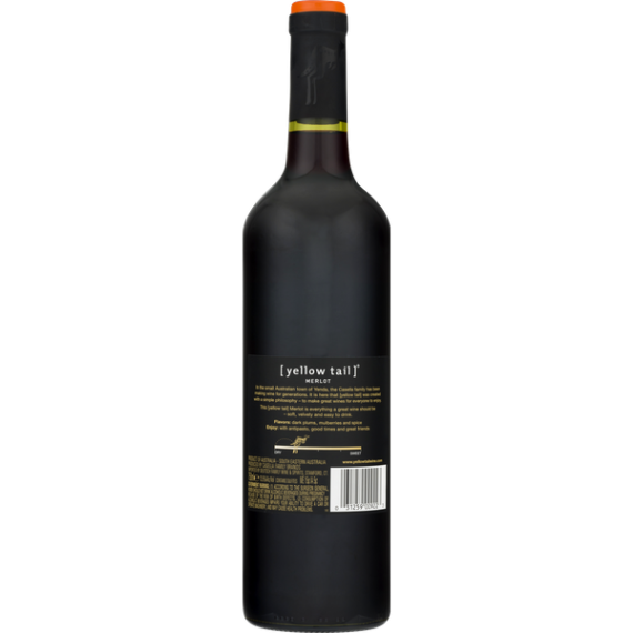 Details Ingredients Merlot Grapes, Flavors (Dark Plums, Mulberries and Spice). Product features Yellow Tail Merlot Wine is a versatile addition to your collection. It's soft, velvety and easy to drink. Enjoy this Yellow Tail Merlot with antipasto, good times and your best friends. This wine was grown in the sunny regions of Australia and benefits from that continent's unique climate. Open a bottle at your next gathering to make the party more memorable. The full body of this wine is an excellent way to tell your guests that it's time to enjoy themselves. Yellow Tail Merlot Wine, 750 ml: Flavor is ripe plums with a warm touch of spice Product of southeastern Australia Merlot vintage 2008 13.5% alcohol by volume Yellow Tail is everything a great wine should be. It's approachable, fresh, flavorsome and has a personality all of its own. Special Features Spicy