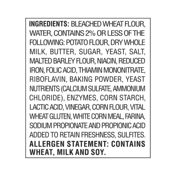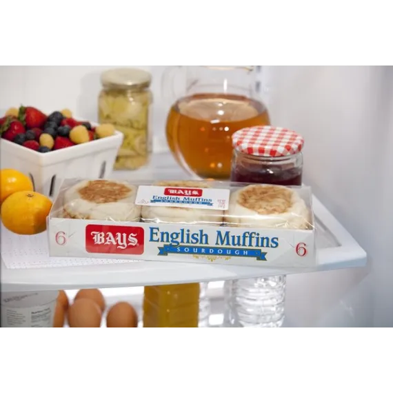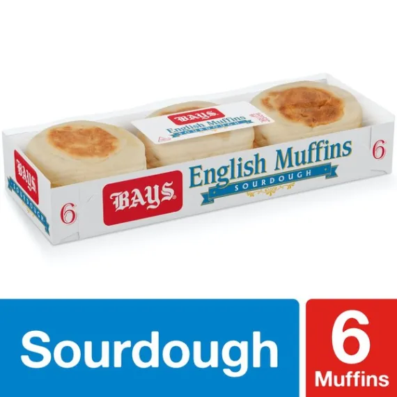 Details Ingredients Bleached Wheat Flour, Water, Contains 2% Or Less Of The Following: Potato Flour, Dry Whole Milk, Butter, Sugar, Yeast, Salt, Malted Barley Flour, Niacin, Reduced Iron, Folic Acid, Thiamin Mononitrate, Riboflavin, Baking Powder, Yeast Nutrients (Calcium Sulfate, Ammonium Chloride), Enzymes, Corn Starch, White Corn Meal, Farina, Sodium Propionate And Propionic Acid Added To Retain Freshness, Sulfites. Show more Product features Bays English Muffins have been known and loved for decades for their rich, wholesome flavor and delightful texture. Baked from a proud family recipe, our muffins bring their own unique taste and texture to the longstanding tradition of sourdough. They toast up golden brown light and crunchy on the outside and soft and tender inside. While they are legendary for breakfast, they are also a great way to build a sandwich for lunch, a mini meal at dinner, a bun for your burger or a snack anytime of day. And for added convenience, they come pre-sliced and ready to go. 6 Bays Sourdough English Muffins per container; pre-sliced for convenience Perfectly balanced Bays tangy, creamy goodness in the sourdough tradition Toast to enjoy the perfect mix of soft and tender insides with a light, tender crunch Delicious anytime of day, anywhere The perfect way to make breakfast sandwiches, lunch sandwiches, and dinner paninis better; part of a perfectly balanced Reuben Kosher Special Features Kosher Net Quantity of Content 6.0 X 1 Muffin